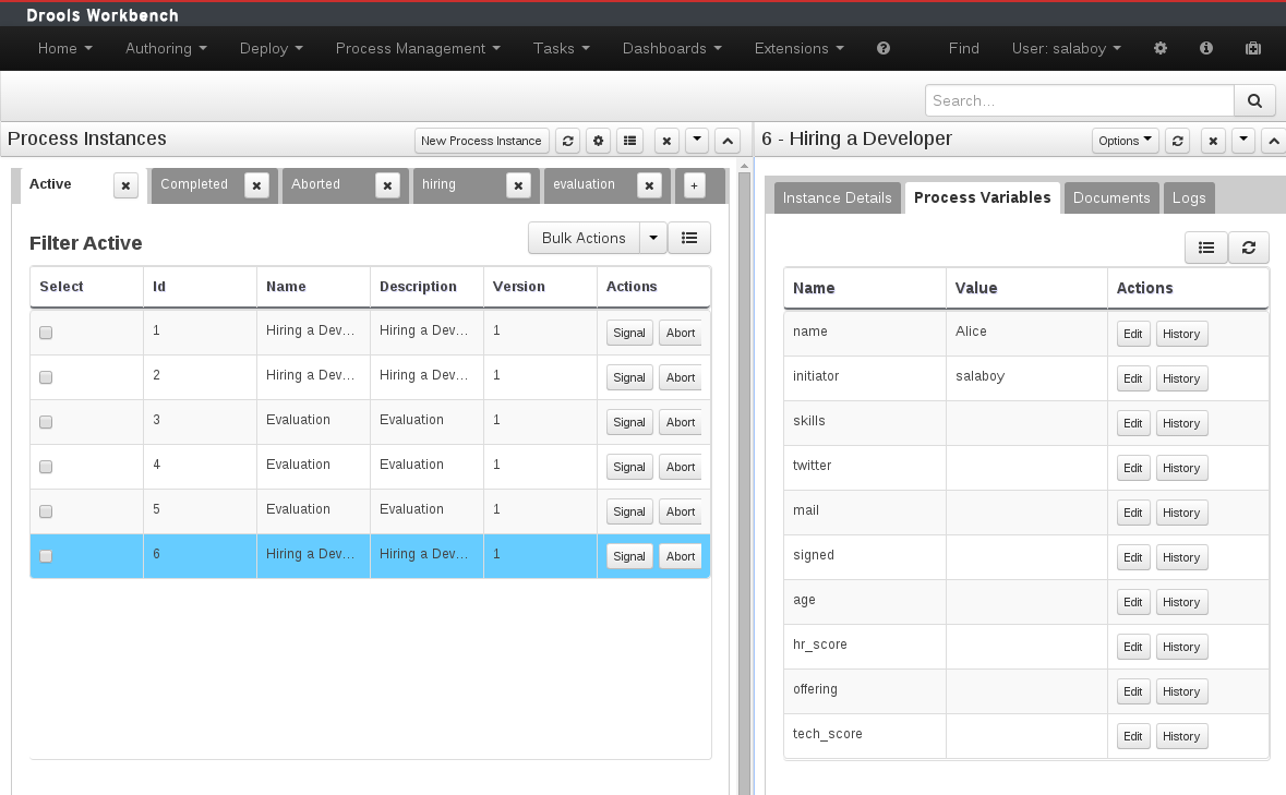 The process instances section is composed by two main screens: the Process Instance Lists and the Process Instance Details. In this case the Process Instance Details provides several tabs with the runtime information related with the process.