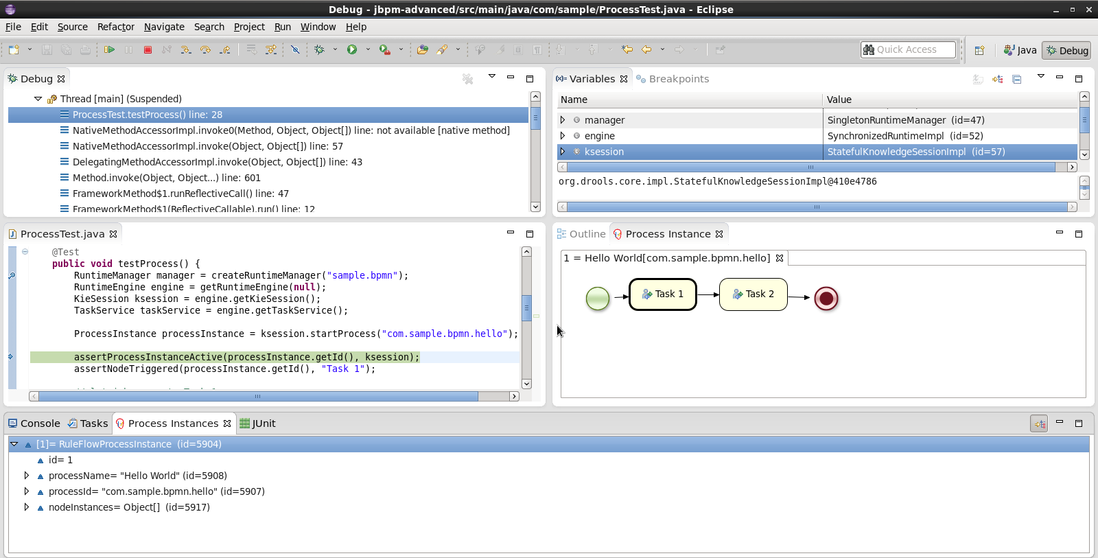 Next, use a (regular) Java breakpoint to stop your application at a specific point (for example right after starting a new process instance). In the Debug perspective, select the ksession you would like to inspect, and the Process Instances view should show the process instances that are currently active inside that ksession. For example, the screenshot below shows one running process instance (with id "1"). When double-clicking a process instance, the process instance viewer will graphically show the progress of that process instance. An example where the process instance is waiting for a human actor to perform "Task 1" is shown below.