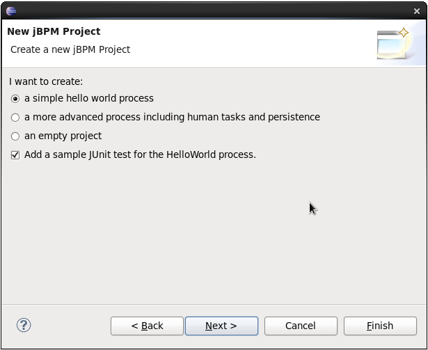 The aim of the new project wizard is to set up an executable sample project to start using processes immediately. This will set up a basic structure, the classpath, sample process and a test case to get you started. To create a new jBPM project, in the "File" menu select "New" and then "Project ..." and under the jBPM category, select "jBPM Project". A dialog as shown below should pop up.