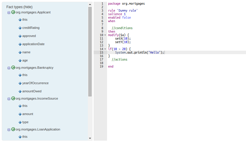 New Data Modeller replaces the declarative Fact Model Editor; bringing authoring of Java classes to the authoring environment. Java classes are packaged into the project and can be used within rules, processes etc and externally in your own applications.