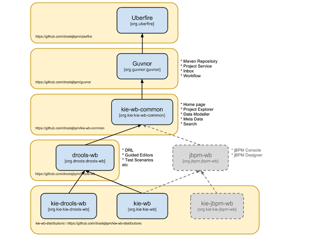 The Guvnor brand leaked too much from its intended role; such as the authoring metaphors, like Decision Tables, being considered Guvnor components instead of Drools components. This wasn't helped by the monolithic projects structure used in 5.x for Guvnor. In 6.0 Guvnor 's focus has been narrowed to encapsulates the set of UberFire plugins that provide the basis for building a web based IDE. Such as Maven integration for building and deploying, management of Maven repositories and activity notifications via inboxes. Drools and jBPM build workbench distributions using Uberfire as the base and including a set of plugins, such as Guvnor, along with their own plugins for things like decision tables, guided editors, BPMN2 designer, human tasks.